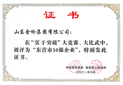 2021年6月27日,在東營市市委、市政府舉辦的“實(shí)干突破”大競賽、大比武活動中,山東金嶺集團(tuán)有限公司被評為“東營市30強(qiáng)企業(yè)”。以表彰公司踐行新的發(fā)展理念,不斷提高創(chuàng)新能力、優(yōu)化產(chǎn)品結(jié)構(gòu)、深入發(fā)展循環(huán)經(jīng)濟(jì)、履行社會責(zé)任等方面做出的積極貢獻(xiàn)。