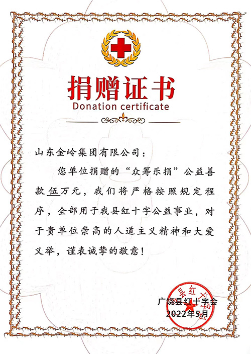 2022年5月8日,在廣饒縣首屆“5.8人道公益日”眾籌樂捐活動(dòng)啟動(dòng)儀式上,金嶺集團(tuán)向廣饒縣紅十字會(huì)現(xiàn)場捐贈(zèng)人民幣5萬元。多年來,公司大力支持社會(huì)公益事業(yè),積極參與愛心捐贈(zèng)活動(dòng),多次受到表彰,彰顯了公司強(qiáng)烈的社會(huì)責(zé)任感,體現(xiàn)了公司的擔(dān)當(dāng)精神。