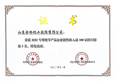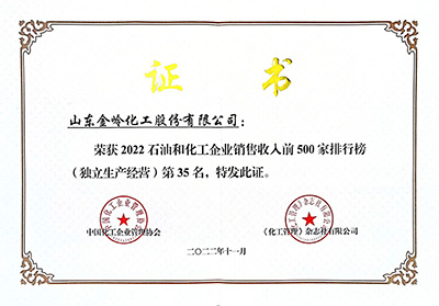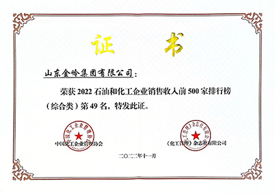 2022年11月29日,由中國石油和化學(xué)工業(yè)聯(lián)合會與化工企業(yè)管理協(xié)會主辦的中國石油和化工企業(yè)500強(qiáng)發(fā)布會以網(wǎng)絡(luò)會議形式召開。在會上,中國石化聯(lián)合會、化工企業(yè)管理協(xié)會聯(lián)合發(fā)布了“2022中國石油和化工企業(yè)銷售收入前500家”榜單,金嶺集團(tuán)位列綜合類第49位;金嶺化工股份公司位列獨(dú)立生產(chǎn)經(jīng)營類第35位、位列“中國專用化學(xué)產(chǎn)品企業(yè)銷售收入前100家”第3位。