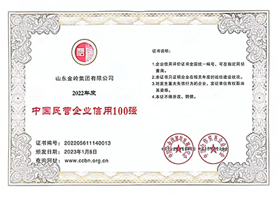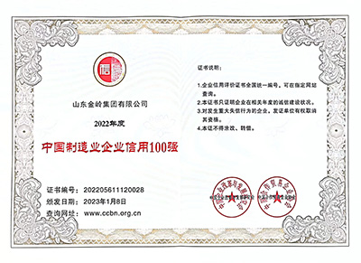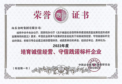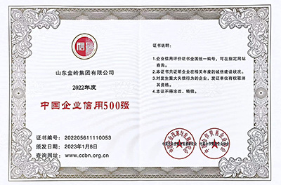 2023年1月8日,在中國企業(yè)改革與發(fā)展研究會、中國合作貿(mào)易企業(yè)協(xié)會主辦的“2023中國企業(yè)信用發(fā)展論壇暨第十四界誠信公益盛典”會議上,金嶺集團(tuán)榮獲2022年度 “中國企業(yè)信用500強(qiáng)” 、“中國制造業(yè)企業(yè)信用100強(qiáng)”、“中國民營企業(yè)信用100強(qiáng)”、“培育誠信經(jīng)營、守信踐諾標(biāo)桿企業(yè)”榮譽(yù)稱號。多年來,公司始終高度重視企業(yè)誠信體系建設(shè)、加強(qiáng)合同履約考核,提升全體員工誠信意識,樹立了良好的企業(yè)信用形象。
