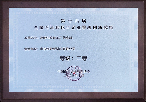 2023年10月26日,中國(guó)化工企業(yè)管理協(xié)會(huì)在青島召開(kāi)第十六屆全國(guó)石油和化工企業(yè)管理創(chuàng)新大會(huì),金嶺新材料公司創(chuàng)新成果“智能化改造工廠的實(shí)踐”榮獲二等獎(jiǎng)。