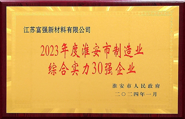 2024年2月18日,在淮安市委市政府召開的全市重特大項(xiàng)目攻堅(jiān)暨優(yōu)化營(yíng)商環(huán)境大會(huì)上,江蘇富強(qiáng)新材料有限公司被評(píng)為“2023年度淮安市制造業(yè)綜合實(shí)力30強(qiáng)企業(yè)”。
