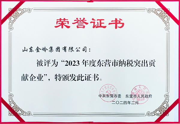 2024年2月20日,在東營(yíng)市委、市政府召開(kāi)的東營(yíng)市2023年度綜合表彰暨高質(zhì)量招商引資項(xiàng)目建設(shè)大會(huì)上,山東金嶺集團(tuán)有限公司被評(píng)為“東營(yíng)市納稅突出貢獻(xiàn)企業(yè)”,總裁趙棟被授予“全市加力工業(yè)經(jīng)濟(jì)、‘四新’經(jīng)濟(jì)、數(shù)字經(jīng)濟(jì)突破先進(jìn)個(gè)人”榮譽(yù)稱(chēng)號(hào),以表彰公司在復(fù)雜的經(jīng)濟(jì)形勢(shì)下,依法納稅、誠(chéng)信經(jīng)營(yíng),對(duì)地方經(jīng)濟(jì)發(fā)展做出的突出貢獻(xiàn)。