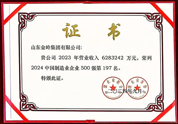 2024年9月,中國企業(yè)聯(lián)合會、中國企業(yè)家協(xié)會發(fā)布2024中國企業(yè)500強(qiáng)、2024中國制造業(yè)企業(yè)500強(qiáng)榜單,金嶺集團(tuán)位列“2024中國企業(yè)500強(qiáng)”第385位;“2024中國制造業(yè)企業(yè)500強(qiáng)”第197位;公司已連續(xù)多年入圍中國企業(yè)500強(qiáng)、中國制造業(yè)企業(yè)500強(qiáng)。